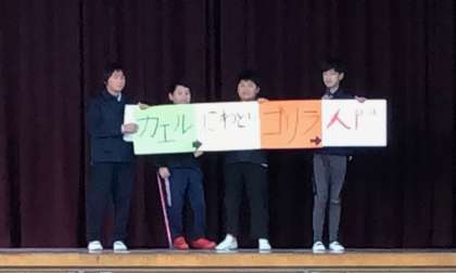 じゃんけんに勝つと、カエルからニワトリ、ゴリラ、にんげんへと進化していきます。すぐに人間になった子、ずっとカエルのままの子とさまざまでしたが、とても楽しく寒さも吹きとびました。