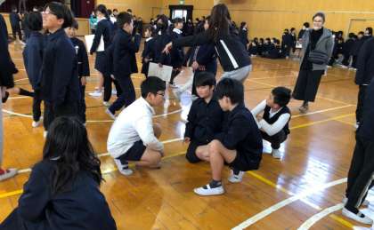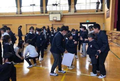 今日の集会は「進化じゃんけん」でした。1年生と6年生はペアを組んで行いました。