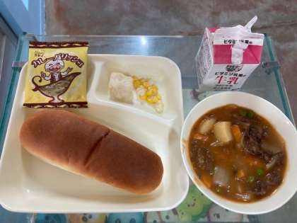 ビーフシチュー、カリフラワーとコーンのサラダ、カレーフィッシュ、おさつパン、牛乳