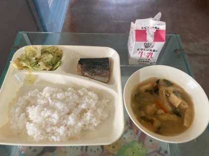 本日の献立 さごしのしょうゆだれかけ、みそ汁、キャベツの赤じそあえ、ごはん、牛乳