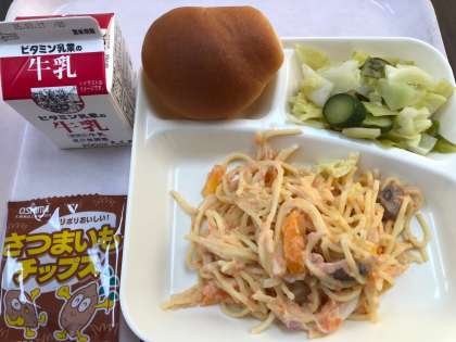 さけのクリームスパゲッティ、キャベツときゅうりのサラダ、おさつチップス、ミニコッペパン、牛乳  です。