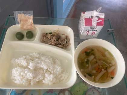 本日の献立 豚肉と野菜の炒め物、五目汁、よもぎだんご、きな粉、ごはん、牛乳