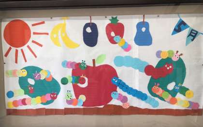 新年度も早いもので5月を迎えました。玄関掲示はかわいいはらぺこあおむしに模様替え。