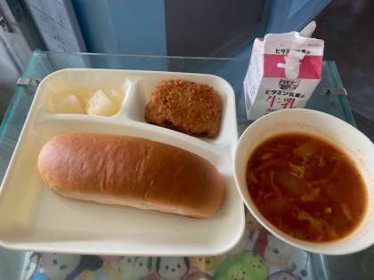 本日の献立 トンカツ、ミネストローネ、和なし(かんづめ)こくとうパン、牛乳