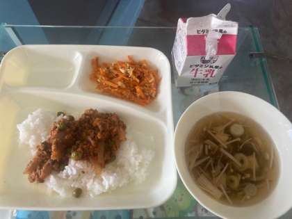 タコライス、とうふともずくのとろり汁、にんじんしりしり風、ごはん、牛乳