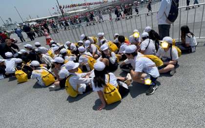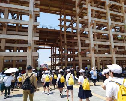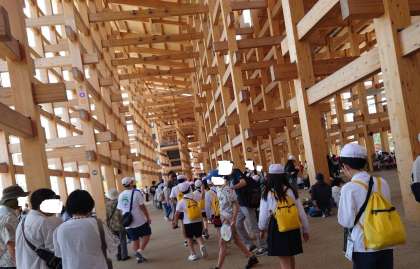 たくさんの団体が来場しており、入場までしばらく待つことになりましたが、無事に到着しました。大屋根リングの下を通って休憩所へ向かいお弁当タイムです。