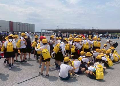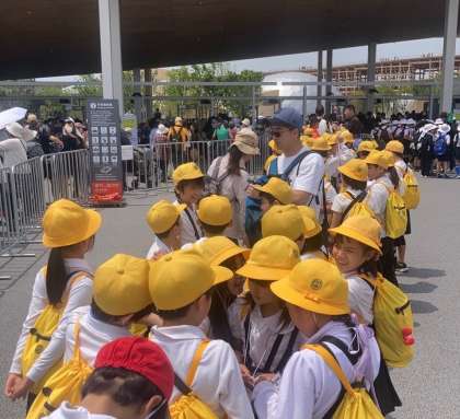 絶好の遠足日和、3.4年生が万博会場に到着しました。今日もたくさんの団体が来場しています。