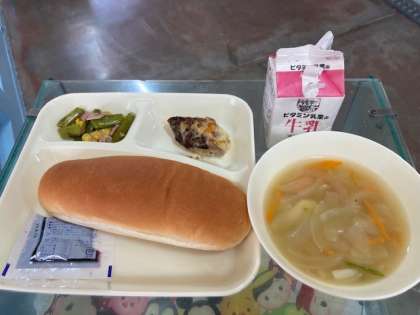かつおのガーリックマリネ焼き、押麦のスープ、グリーンアスパラガスのソテー、コッペパン、ブルーベリージャム、牛乳