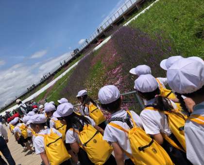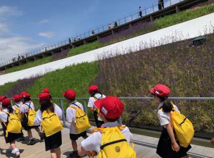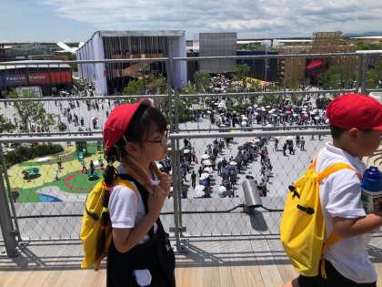 大屋根リングを歩いています。天気も良く、いい景色。たくさんのパビリオンも見えます。
