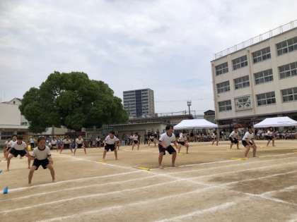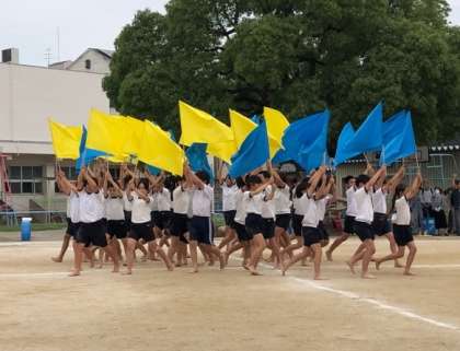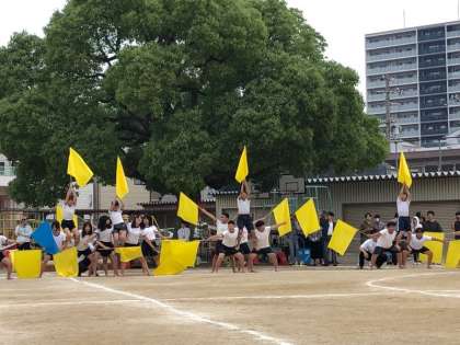 かっこいいボディパーカッションに続き、一糸乱れぬフラッグの演技が始まりました。観客席から、「おお〜」という驚きと称賛の声が上がっています。