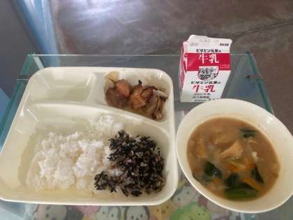 本日の献立 鶏肉の甘辛焼き、みそ汁、魚ひじきそぼろ、ごはん、牛乳