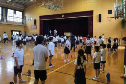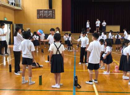 今日の児童集会は、たてわり班で円になって、ボールを使ったゲームをしました。