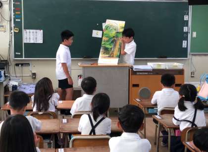 今朝は図書委員さんがお話しを届けに教室へ行きました。