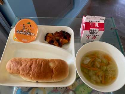 かぼちゃのミートグラタン、スープ、みかんゼリー、おさつパン、牛乳