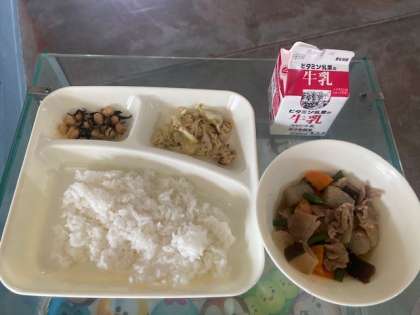 豚肉と野菜の煮物、ひじき豆、ささみとキャベツのごまみそ焼き、ごはん、牛乳