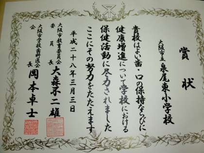 3月7日(月) よい歯・口の保持と健康増進について、学校の保健活動に努力したと、教育委員会と学校歯科医会から賞状を頂きました。