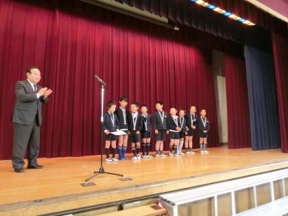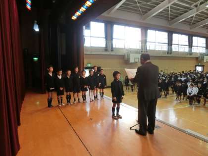 今日の朝会で表彰状と、全員にメダルの授与を行いました。