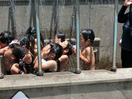 シャワーと初めてのプールの様子です。