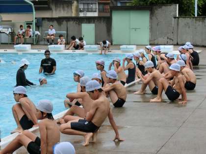 子どもたちは、今シーズン初めてのプール授業に大喜びです。