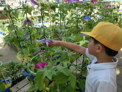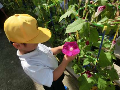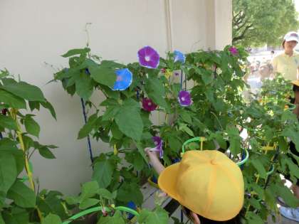 アサガオの花を摘んで1組は色水を作り、2組は押し花作りに挑戦しました。