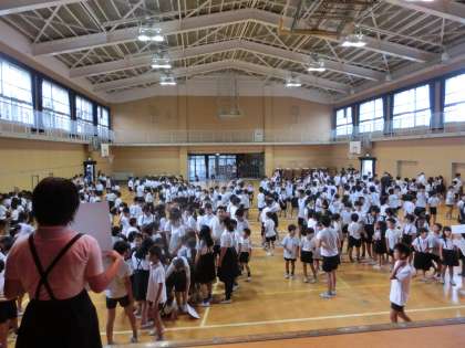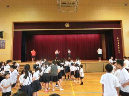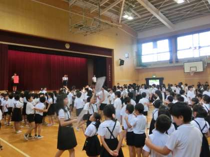 赤と白の画用紙で、正解だと思う答えの方に集まります。