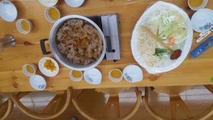 2日目の夕食はカモ鍋です。お鍋の中は(鴨肉、白菜、キャベツ、えのき、長ねぎ、ニンジン、うどんなど)と、大変豪華です。