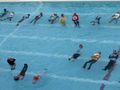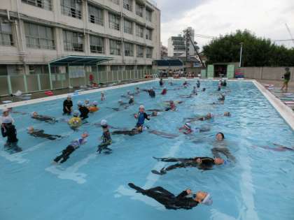 ペットボトルにつかまり浮く練習や水着と違って着衣では泳ぎにくいことを体験しました。