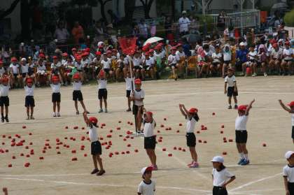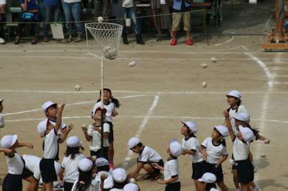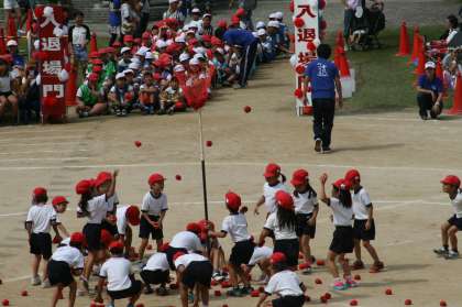 音楽が変わるとみんな一斉に玉入れをしたり踊りに変わったり、1年生らしい競技にみんな一生懸命チャレンジしていました。
