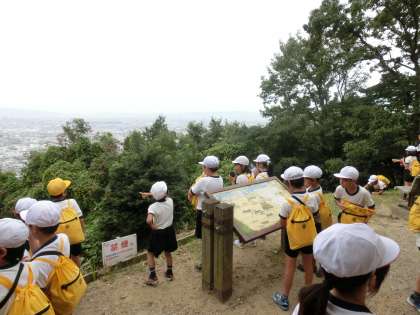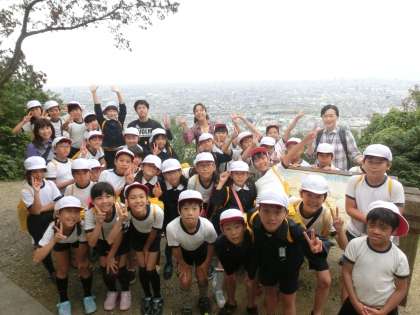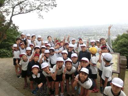 枚岡神社から上った登山道でどんぐり拾いをした後、枚岡山展望台でクラスごとの写真撮影を行ないました。