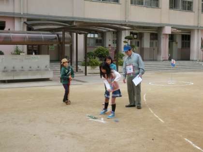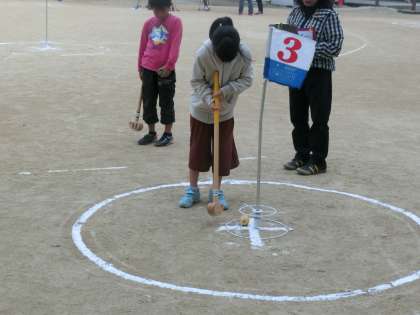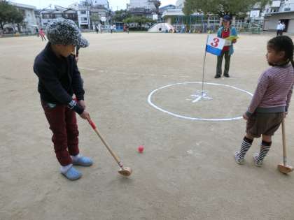 初めてグランドゴルフをやる小学生には、スタート前に地域の方が丁寧に教えて下さいました。