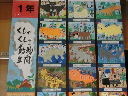 1年生は「くしゃくしゃ動物王国」色々な動物と一緒に行動する様子があらわされています。