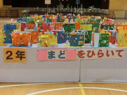 2年生は「まどをひらいて」個性豊かにいろいろな形をした窓をつくっています。窓の中のようすも描かれています。