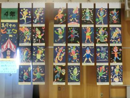 4年生は「真夜中のピエロ」多彩な色使いで暗い背景だが明るく感じる作品になっている。