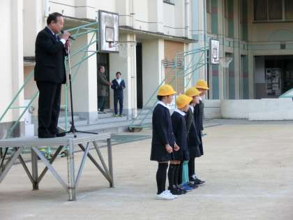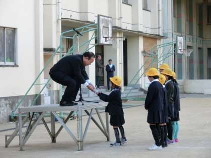 今日の朝会も表彰からスタートしました。女子のバレーボールで5年生の部「優勝」楯の授与です。児童全員から祝福拍手を受けて、とても誇らしげに見えました。