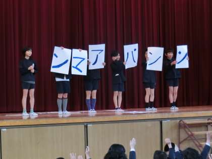 今日の児童集会はキャラクター当てクイズ。