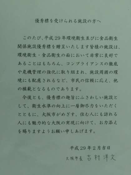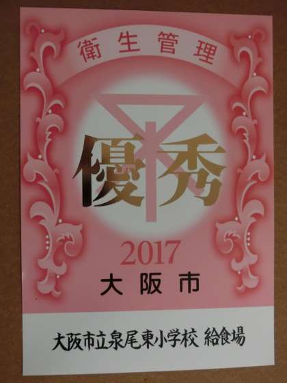 今年度も給食室の環境衛生・食品衛生の面において非常に良好であると大阪市から優秀標をいただきました。