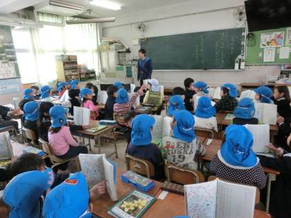 保健室や図書室などの施設を見学した後、1年生の教室で一緒に机に座り、国語の本を読む体験をしました。