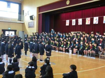 在校生からのお祝いとして、1年生から順に5年生までの生徒が、各学年ごとに6年生へお祝いの言葉と歌を贈りました。