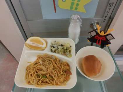 5月2日(火) カレースパゲッティ、キャベツのひじきドレッシング、河内ばんかん