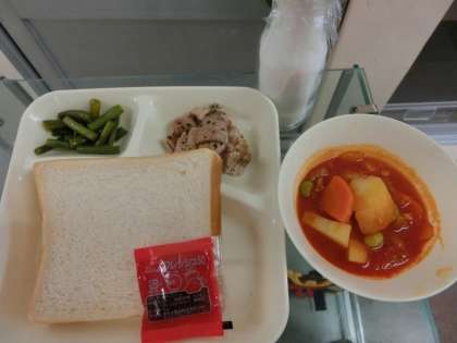 5月10日(水)鶏肉のバジル焼き、ケチャップ煮、三度豆のソテー、パン、いちごジャム、牛乳