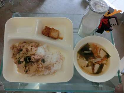 5月12日(金)豚丼、五目汁、あつあげのしょうがじょうゆかけ、ごはん、牛乳
