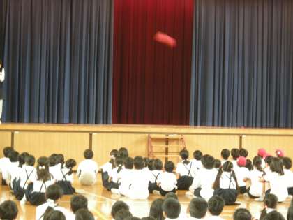 5月17日(水)児童集会で「何がとんでいるんでしょうか」ゲームが行われました。たてわり班で考えて答えていました。写真はレモン石鹸の模型です。最後には城谷教頭先生が出てきました。さすがにとぶことはできませんでしたが・・・。