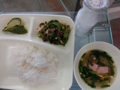 チンジャオニューロウスー、ハムと野菜の中華スープ、キュウリの辛みづけ