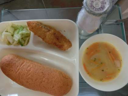 6月16日(金)サーモンフライ、コーンスープ、キャベツのソテー、ライ麦パン、牛乳
