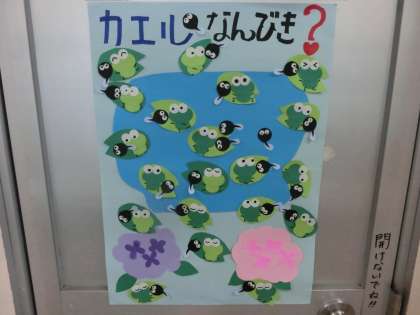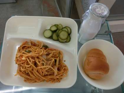 ミートソーススパゲッティはボリュームたっぷり!!でした。きゅうりのピクルスは爽やかな味でした。梅雨らしい天気になってきましたが、素敵な掲示物を見つけました。どこにあるか、みなさん、わかりますか?