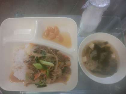 7月12日(水)牛丼、すまし汁、大福豆の煮もの、ごはん、牛乳