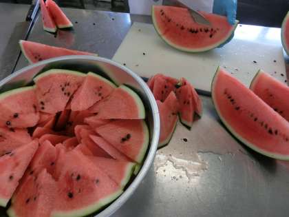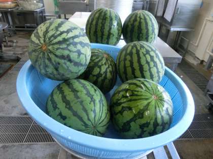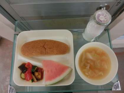 7月13日(木)押し麦のスープ、夏野菜とベーコンのソテー、すいか、ライ麦パン、牛乳