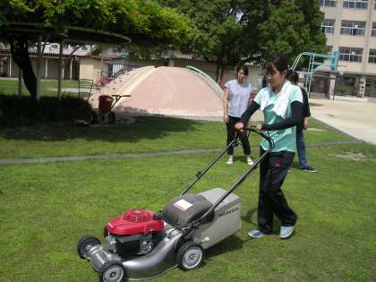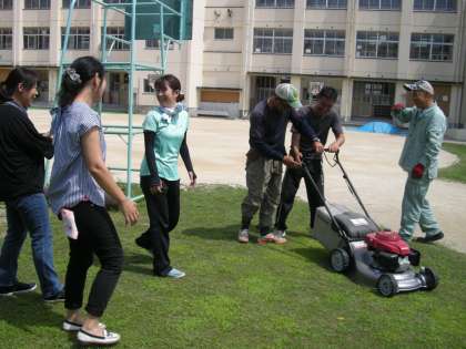 7月14日(金)午後2時よりPTAの芝刈りがありました。担当の人権啓発活動委員会と役員さんで、造園業者さんに教えてもらいながら、芝刈りと肥料まきをしました。