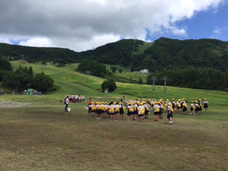 予定より早くハチ高原に到着しました。開舎式をすませ、高原でお弁当を食べています。みんな元気です。気温は日なたで31度です。