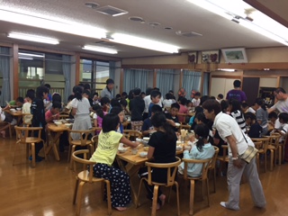 夕食はすき焼きです。6〜7人で一つの鍋を協力して作っていきます。味の方はいかがでしたでしょうか。たくさんのお肉に満足そうでした。